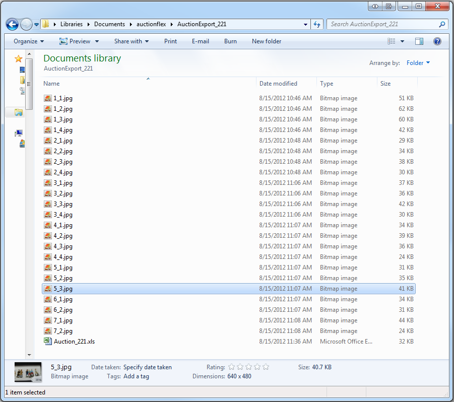 Once you've built your catalog, you need an easy way to export it. Auction Flex gives you a very powerful Auction Export form that gives you complete control over what fields to export, what images to export, how to have the image filenames named, and what file type to create.